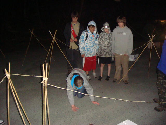 We finally made it back to Station A and were allowed to take the challenge. One lucky (blindfolded) Scout had to search for the objects in the boxes without touching the ropes and structures. The other Scouts were to direct the lucky Scout.